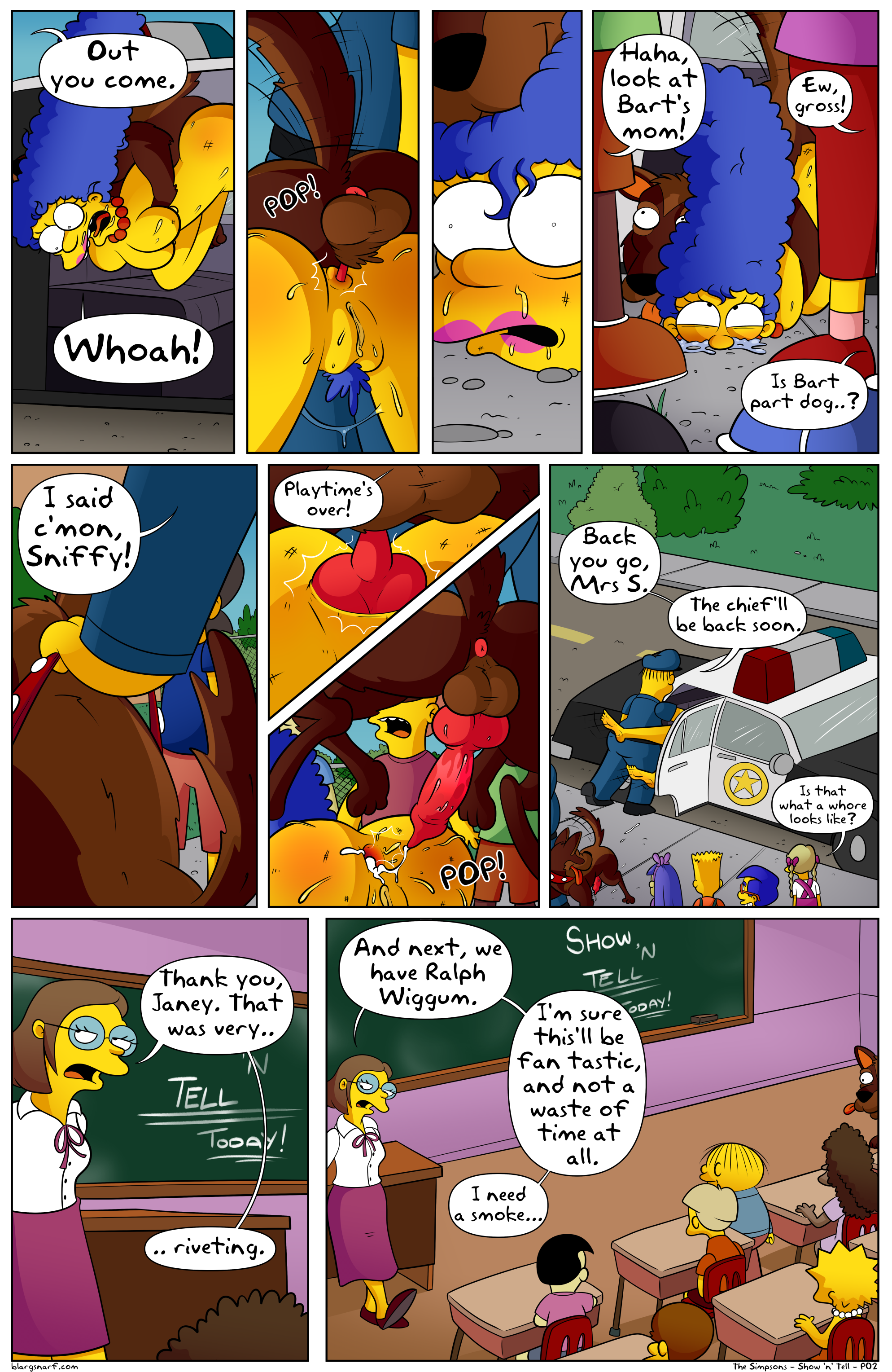 - age difference, anal, anilingus, anilingus on beast, anilingus on male, bestiality, clancy wiggum, comic, cum in mouth, cum in vagina, cum on body, cum on face, degrading, dog, f, faceless female, faceless male, foot on head, group, humiliation, knot, lisa simpson, loli, m, marge simpson, officer sniffy, onlooker, professor john frink, public, recording, show 'n tell, size difference, straight, the simpsons, vaginal